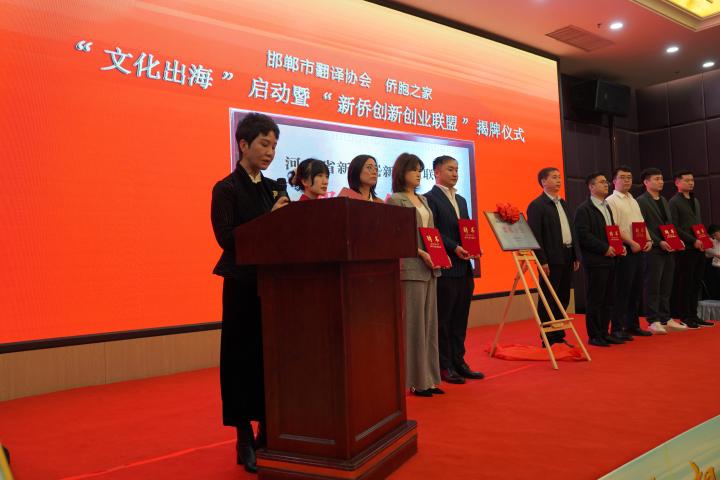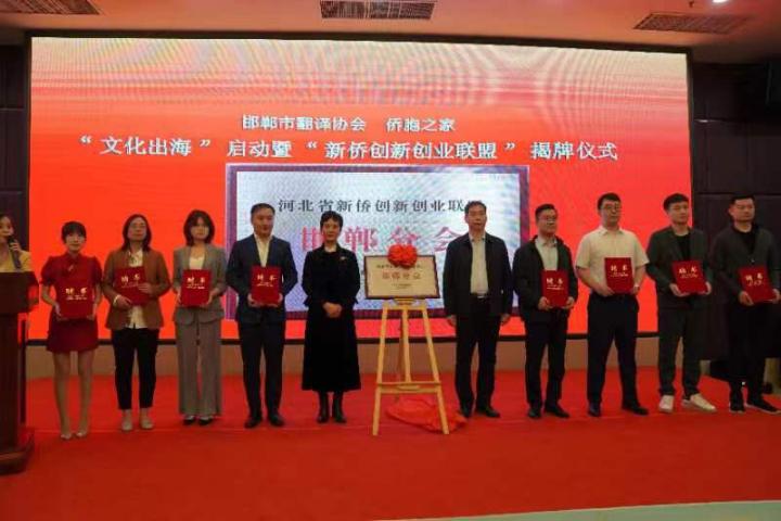 5月6日,邯郸市侨联党组书记侯连书为省新侨创新创业联盟邯郸分会揭牌并为李冰莹、李博、胡嘉豪、韩梦杰、王傲霜、郝瀚、尉迟方舟、张华等8名理事颁发聘书。