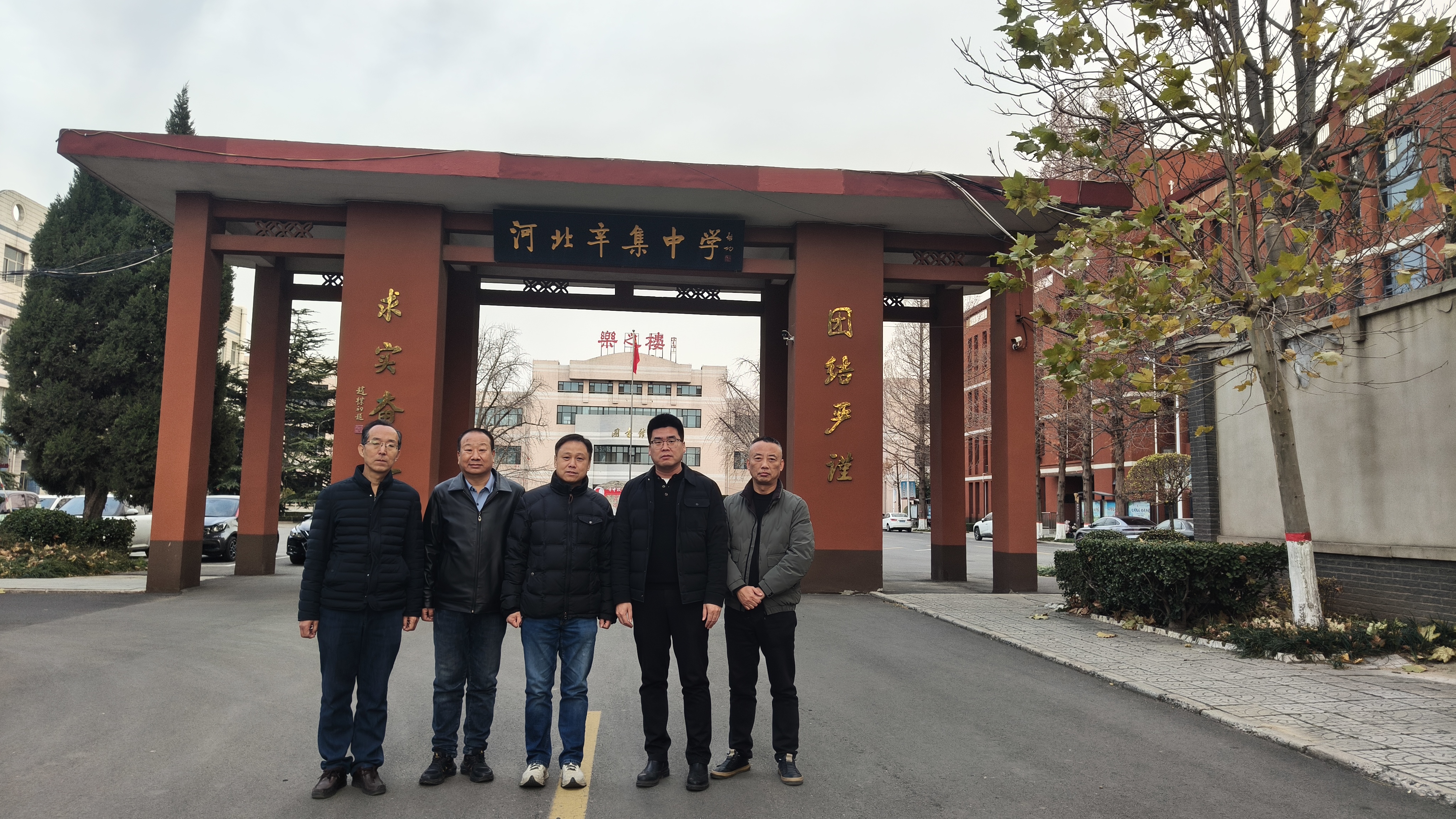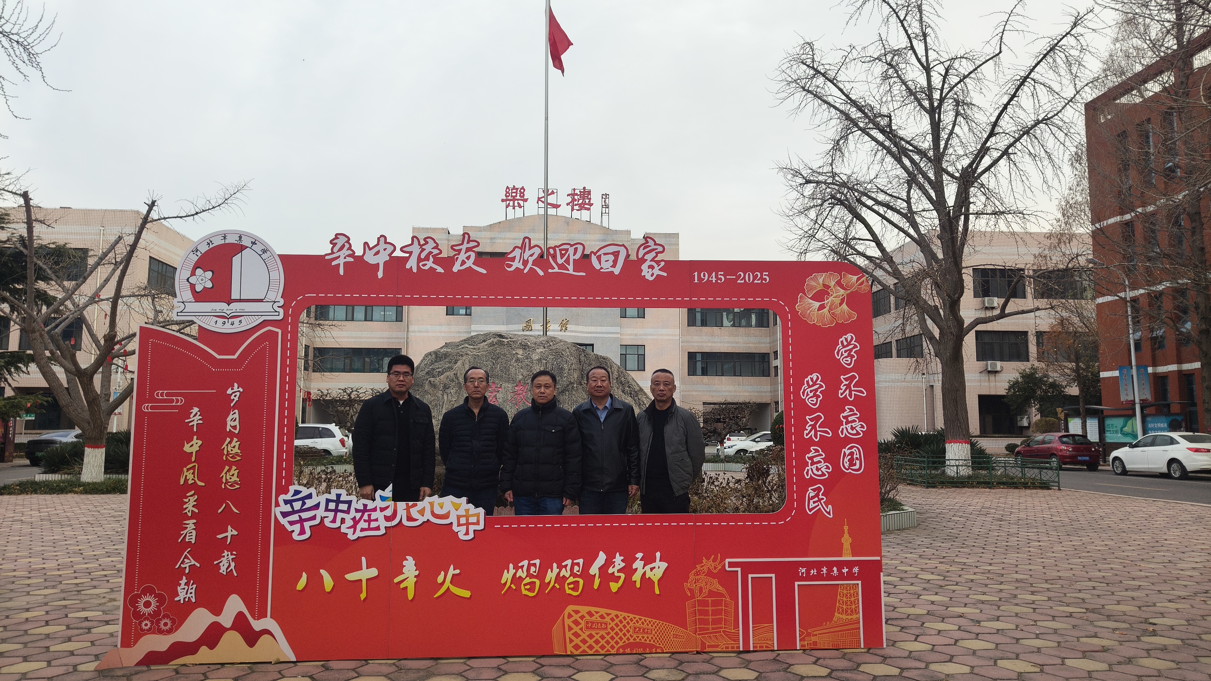 李奎教授回到高中就读的母校——河北辛集中学,参观了就读期间的食堂和教室,并在辛集中学校庆80周年展示牌前与学校党委书记孙剑波合影留念。