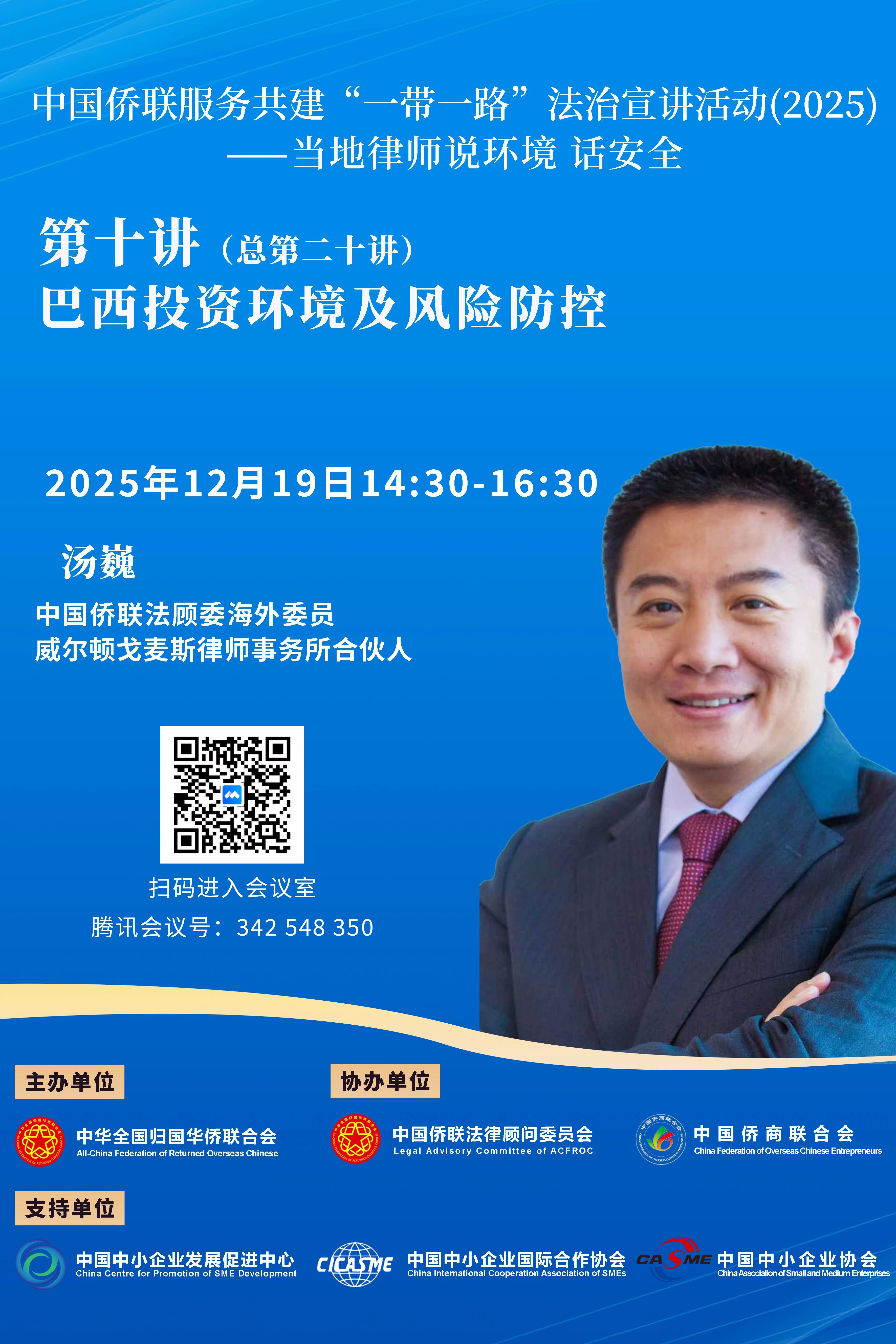 今年第十讲(总第二十讲)将于2025年12月19日(周五)14:30开播,由中国侨联法顾委海外委员巴西汤巍律师主讲。汤巍律师毕业于巴西圣保罗大学法学院,在巴西从事律师工作二十余年,精通巴西民法、公司法、行政法,尤其在外商投资、国际贸易及基础设施建设等领域拥有深厚造诣。汤律师同时在巴西华人协会、巴西广东同乡总会等多家侨团担任重要职务,致力于为巴西当地华人华侨、中资企业及中国驻巴西使领馆提供专业法律服务。