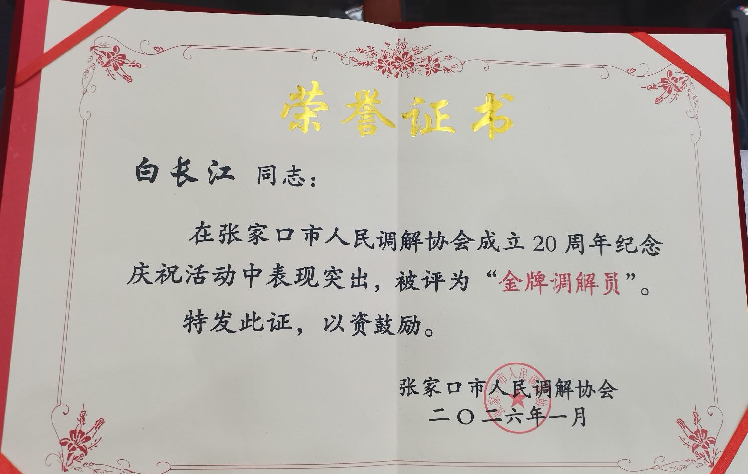 近日,在张家口市人民调解协会成立20周年纪念庆祝活动中,张家口市桥东区人保东辰小区“侨胞之家”负责人白长江凭借在人民调解工作中的突出表现,被授予“金牌调解员”荣誉称号。