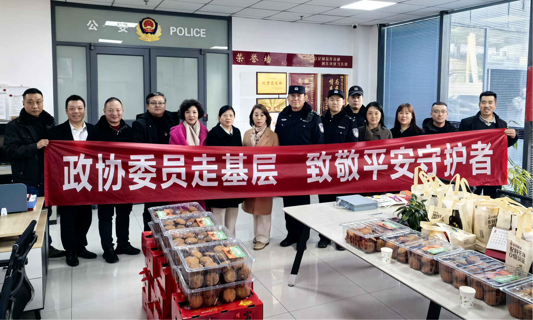 本次活动中,委员们精心准备了150份水果、米面、蛋糕、茶叶等节日慰问品,将实实在在的关怀送到民警身边,向他们长期以来“舍小家、顾大家”,日夜坚守、履职尽责,全力守护市民生命财产安全、维护城市和谐稳定的奉献精神表示诚挚的感谢与崇高的敬意。