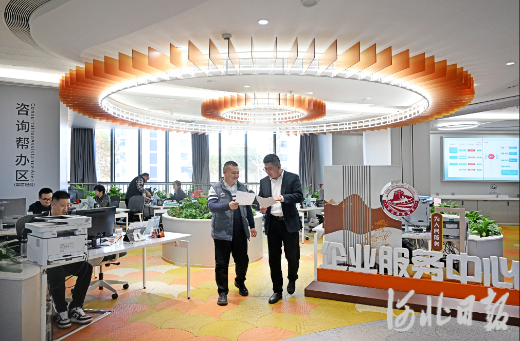 2025年11月21日,石家庄市政务服务中心工作人员(右一)为企业办事员提供服务。河北日报记者张昊摄