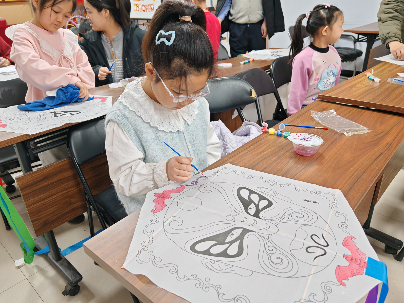 理论知识讲解过后,活动迎来手工制作环节。在黄老师的手把手指导下,孩子们一丝不苟地完成扎骨架、糊纸面、绘图案、系风筝线等每一步操作。竹篾在指尖弯折成形,彩纸在笔下绽放光彩,孩子们还发挥奇思妙想,将京剧脸谱元素绘于风筝之上,一只只独特的风筝逐渐成形。“侨胞之家”工作人员与家长们在旁贴心协助,现场欢声笑语不断,暖意融融。