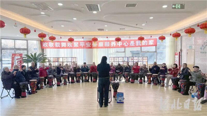 在北戴河区平安秦康颐养中心内,老人们在集体学习打手鼓。(河北日报资料片)河北日报记者孙也达摄