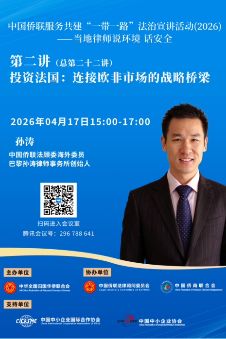 今年第二讲(总第二十二讲)将于北京时间2026年4月17日(周五)15:00开播,由中国侨联法顾委海外委员法国孙涛律师主讲。孙涛律师先后毕业于中国人民大学、法国巴黎第一大学,获得商法学博士学位,同时拥有法国巴黎上诉法院执业律师资格和中国律师执业资格,2010年创办法国巴黎孙涛律师事务所,业务侧重于海外中资企业法务管理和主流业务支持、国际商事纠纷解决等,参与主办过多个中资企业赴欧洲投资并购重点项目。孙律师还担任中国国际经济贸易仲裁委员会仲裁员,曾在仲裁案件中担任国际商会国际仲裁律师,在担任北京2022年冬奥组委欧洲区法律顾问期间,协助北京冬奥组委与国际奥委会、国际残奥委会进行知识产权和国际商事合同谈判。